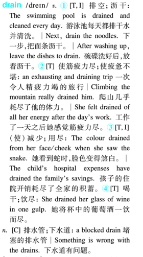drain动词和名词一共5个义项,但是提供了11个例证。这11个例证都非常的典型和生动。一方面展示了这个单词使用的小语境,另一方面,又展示了这个单词作动词时及物、不及物的用法,以及作为及物动词时可以与哪些宾语搭配,并且可以以什么样的形式出现,比如义项2的a draining trip和feel drained of。作名词时,常用的搭配a blocked drain。