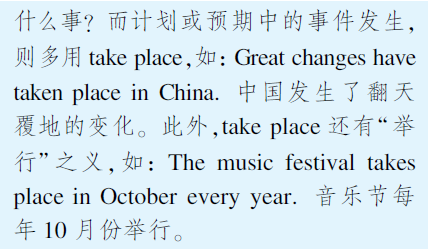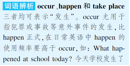 例如,国内常考的occur,happen,take place之间的区别,对于英语母语者来说似乎特别明显,不用辨析。但是对于我国学生来说,这三个表达意思相同,但是用法不同,所以必须进行辨析。之前在请一位长期生活在国外的词典专家进行审稿的时候,他看到这个辨析非常不理解,表示这几个单词还需要辨析吗?《新编英汉学习词典》的主编则非常明确地告诉他,这是中国学生的疑点,难点,必须进行辨析:
