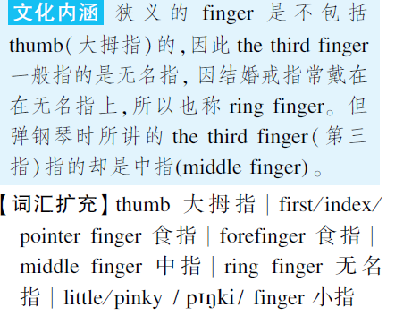 《新编英汉学习词典》有1200多组词汇扩充,700多条同义词,700多条反义词,2000多条派生词。编写这些内容都是为了帮助学生在查询一个单词的时候可以把相关的单词也同时记忆了,提高学习效率。“词汇扩充”栏目编者也下了很多功夫,请看finger词条:
