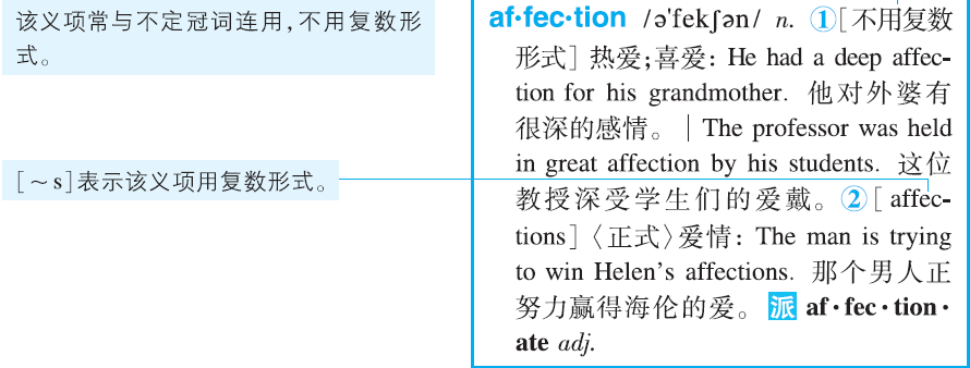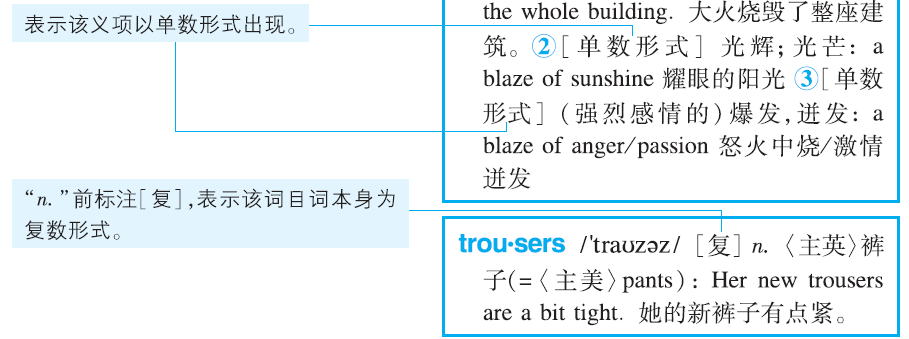 例如,词典空间寸土寸金,但是编者还是用了整整九页的空间,图示词典的用法。尤其需要指出的是,详细说明了词典里的语法标注,方便学生理解用法。例如优化同义词,名词的用法在国外引进的词典中,标注通常是可数,不可数,这些比较常规,比较好理解,比较难理解的是pl. sing. 等其他标注,但是翻看词典的使用说明,却没能说清楚这些标注是什么意思。《新编英汉学习词典》是这样做的: