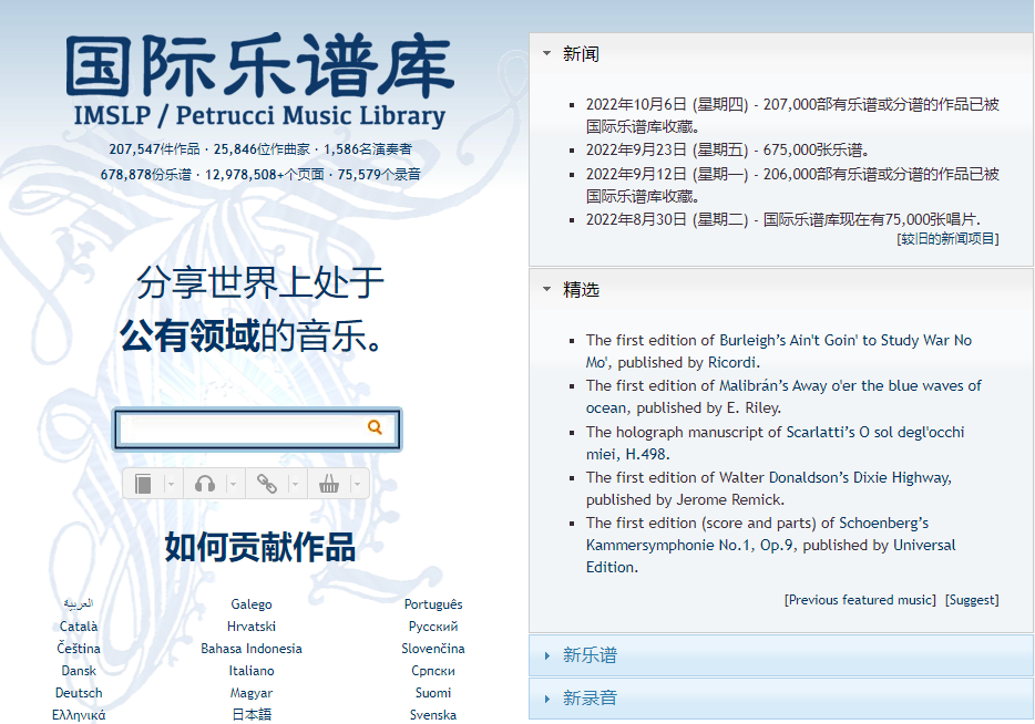 国际乐谱库免费音乐下载歌曲,包含多个国家音乐,全球最大的免费公众版权音乐网站,除了音乐以外还能找到很多乐谱,全部都可免费下载。