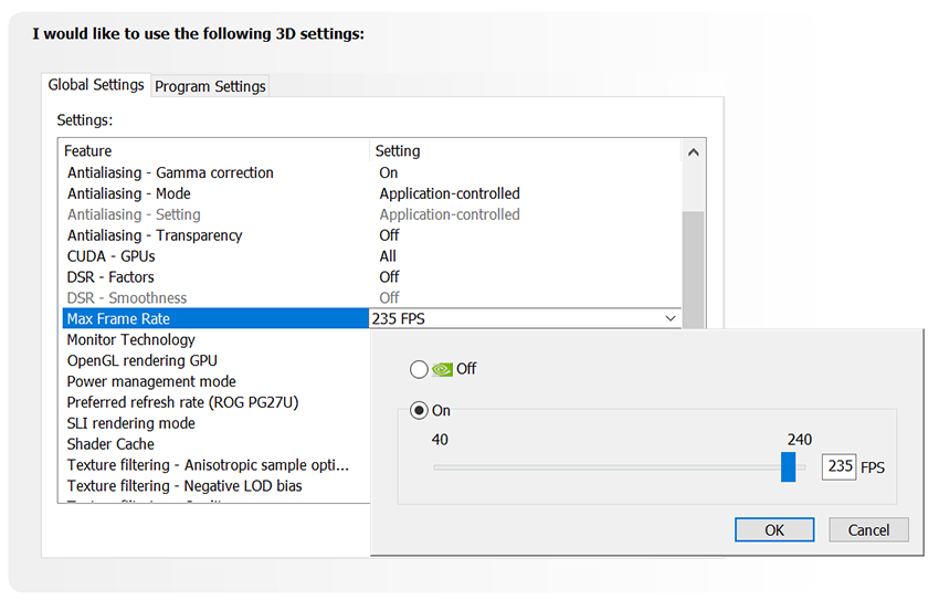 随后是限制最大帧数的功能,这项功能允许玩家通过驱动对于3D游戏或应用的最大渲染帧数进行限制,从而达到省电、减少系统延迟或将帧数拉进G-SYNC范围内的效果。