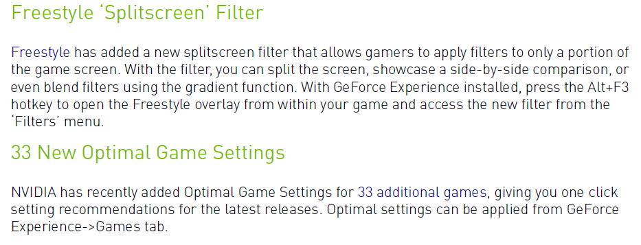 另外,在更新过的GeForce Experience中,NVIDIA加入了33款游戏的画面优化支持,部分游戏列表如下: