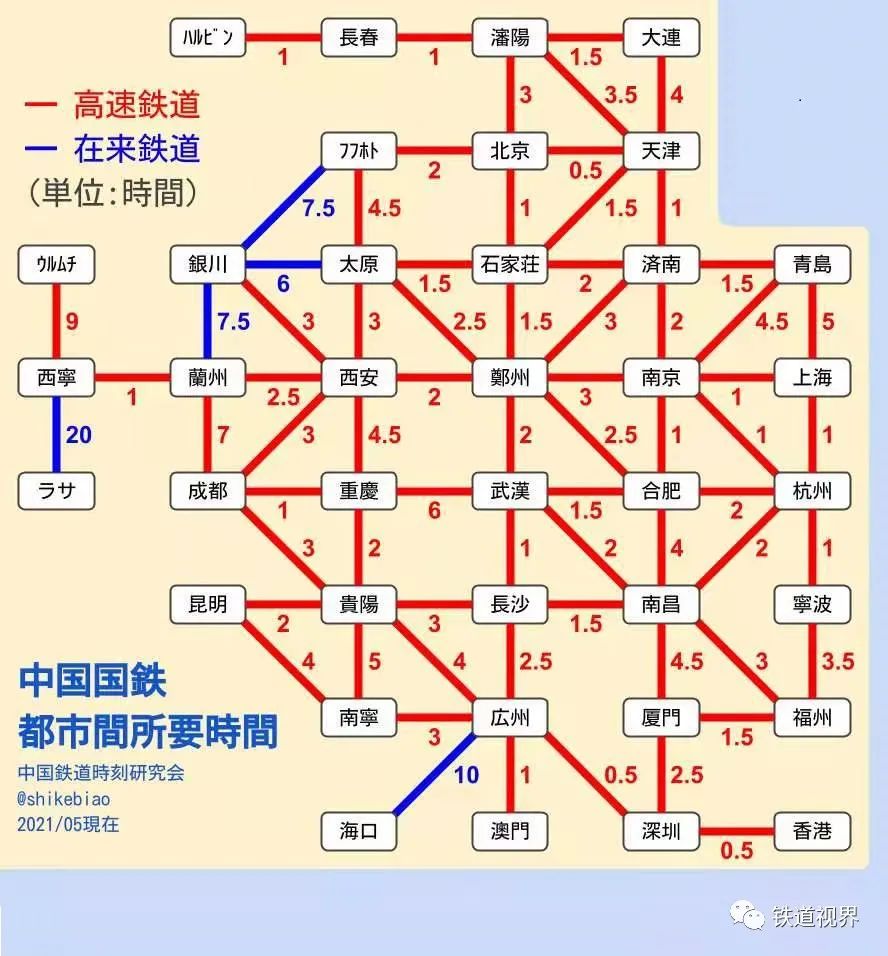 图中红色线代表高铁列车的时间,蓝色线代表普速列车的时间,单位是小时