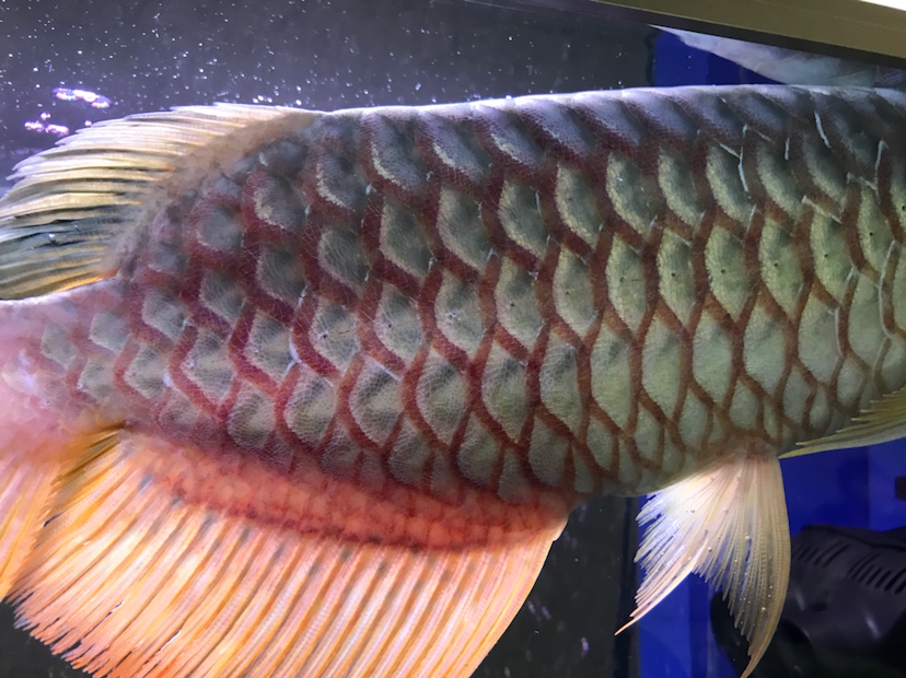 最主要的特点是珠鳞不会亮,同时鳞片只能够亮到第四排,第五排和以上基本是没有表现的,而这一特点也是由宝石龙鱼血统所决定的虽然宝石龙鱼的爬麟不如过背金龙鱼那么优秀,但宝石龙鱼的鳞片在灯光照射后,会显现出粉红色的光泽,后三鳍的颜色也会因为宝石龙鱼种类的不通过而不同,这样的变化也吸引了许多龙鱼玩家。