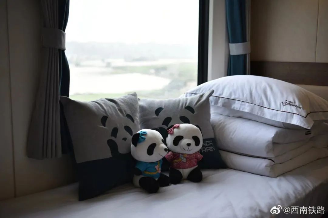 这趟“熊猫专列”由中国铁路成都局集团有限公司组织中车成都机车车辆有限公司打造,共有12辆编组,定员252席。“熊猫专列”由25G型绿皮车按照“移动星级酒店”标准改造而成最新老年火车专列旅游,均为两人间或四人间的卧铺包间,全列覆盖5G无线网络,配备有独立卫生间、恒温淋浴、移动点歌和影音娱乐系统、餐酒吧和棋牌室。
