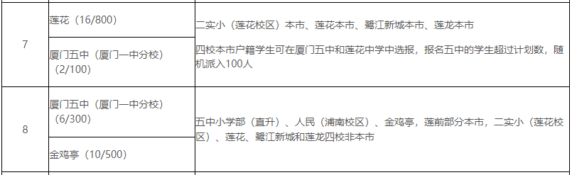 2021年,厦门五中初中部随机派位生源:五中小学部305人、金鸡亭小学10人、人民小学浦南校区8人、二实小莲花校区1人、莲龙小学16人、鹭江新城小学2人、莲花小学9人。