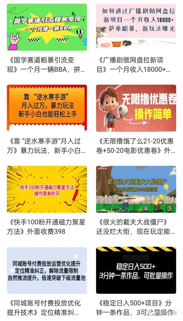 在草根创业资源分享平台上,我们每天更新6-10套精品项目资源,目前已经累计更新上千套资源。加入我们,你可以免费获得全网有关微信运营、短视频营销、直播电商卖货、引流爆粉技术、网络创业等干货分享。我们不仅提供大量当前极具价值的营销资料和项目及思路,还能让你避免花费大量时间独自摸索。