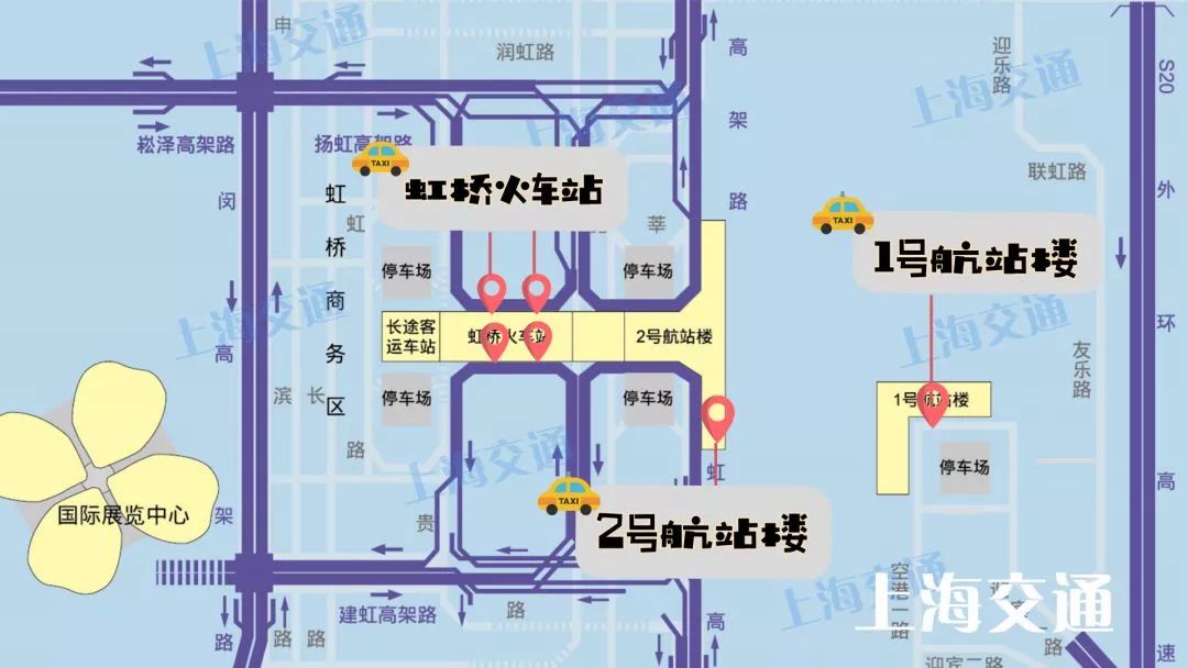 虹桥枢纽的出租汽车上客点共有4个,虹桥火车站有2个(4个入口),虹桥机场T1和T2航站楼各有1个。