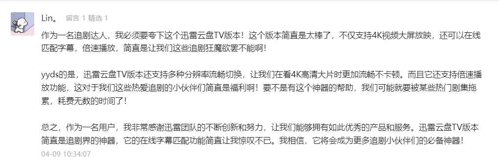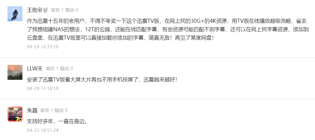 此处已省略N条留言,但足以感受到用户对迅雷TV版的强烈好评……迅雷TV版支持4K视频大屏放映,畅享最高12TB空间,支持在线字幕匹配、倍速播放等功能,用过的都说香!