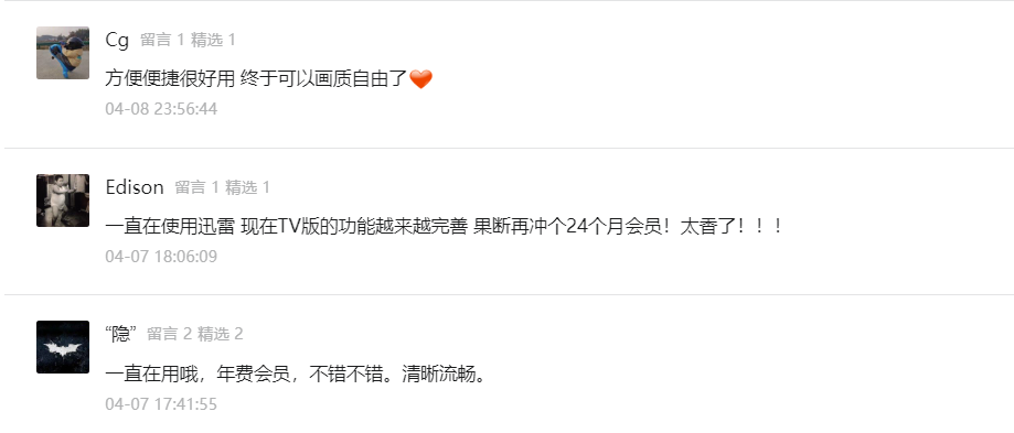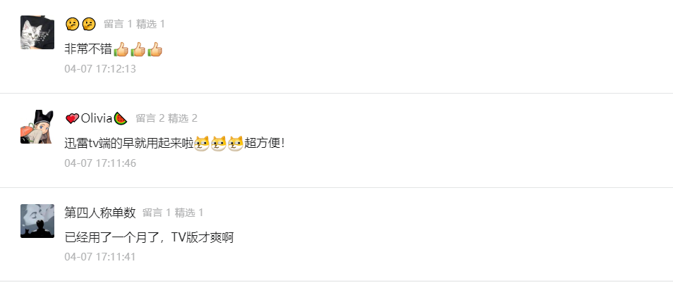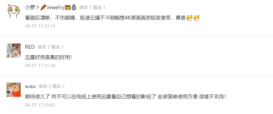 迅雷云盘TV版自上线以来,备受用户好评。《迅雷云盘TV版来啦,解锁真4K视频,香!》一文发出后,后台收到数百条留言,用户纷纷为迅雷TV版实力打call,话不多说,直接上图!
