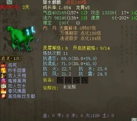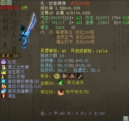 老玩家玩大话2,很多时候是在消费自己的情怀。比如这位玩家足够的预算居然买了一只猴精。仔细一看居然是八开化无猴精。还有感会系统的加持,实力是没什么问题。但是小编觉得真正的卖点还是在于情怀,这个变色方案也是勾起了青春的记忆。