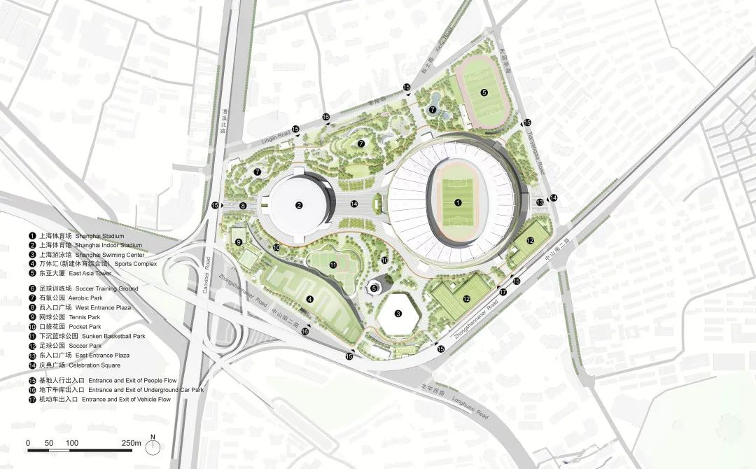 徐家汇体育公园原名上海体育中心,筹建于上世纪60年代。近半个世纪以来先后建成上海体育馆“万体馆”(1973年)、上海游泳馆(1983年)、上海体育场“八万人”和东亚大厦(1997年)。这里相继承办过东亚运动会(1993)、全运会(1997)、世乒赛(2005)、奥运会足球赛(2008)等各类国内外顶级赛事,承载了上海乃至中国体育发展的重要回忆。HPP于2017年赢得该项目国际竞赛,在保留“一场两馆”以及东亚大厦等老建筑基础上对该区域进行重新规划及设计,将其打造成为开放的城市空间。