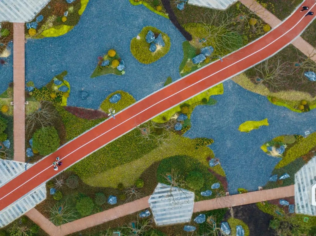 根据街坊界面特性,设计了从外至内,从南至北逐层递减的绿化体系。外围空间以绿化为主,与城市界面互动,内部空间以运动场地为主,营造出在公园中运动的氛围。南面为“运动公园”,沿其界面设计乔木和爬藤,为运动场地阻隔高架噪音和视线,北侧为“有氧公园”,采取开放式导入型绿化,强调公共空间的开放活力和街区共享,完善户外健身休闲空间,融入自然景致,并通过内外双圈跑道的道路系统串联不同区域。