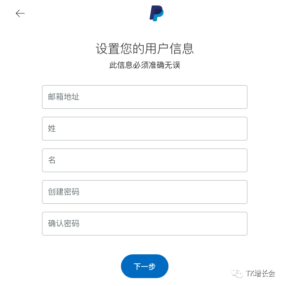 4)填写邮箱(就是PayPal账号)、姓名(必须和身份证一样,中文),设置账号密码;