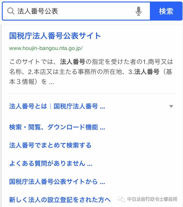 2.直接在网址栏里输入“法人番号公表”六个字,就可以直接看到国税厅的法人番号公表网站(如图)