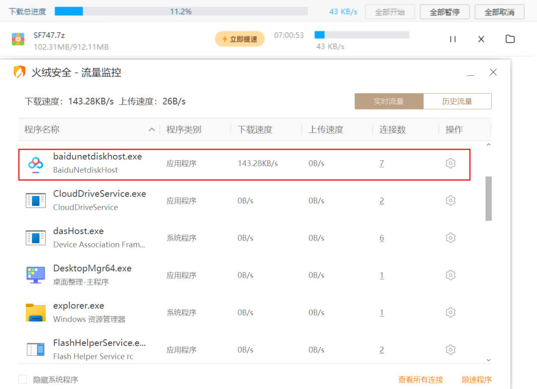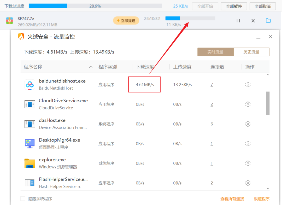 当我们再次返回到百度网盘下载界面中,所看到的速度依然还是十几KB,但通过网速监控器可以看到,实际下载速度为4.61MB/S。