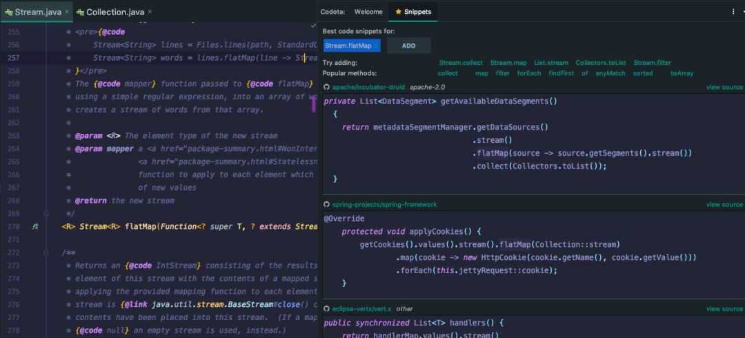 如上图所示,我们想了解Stream类中flatMap函数的用法,可以使用该插件查看知名开源项目的用法。