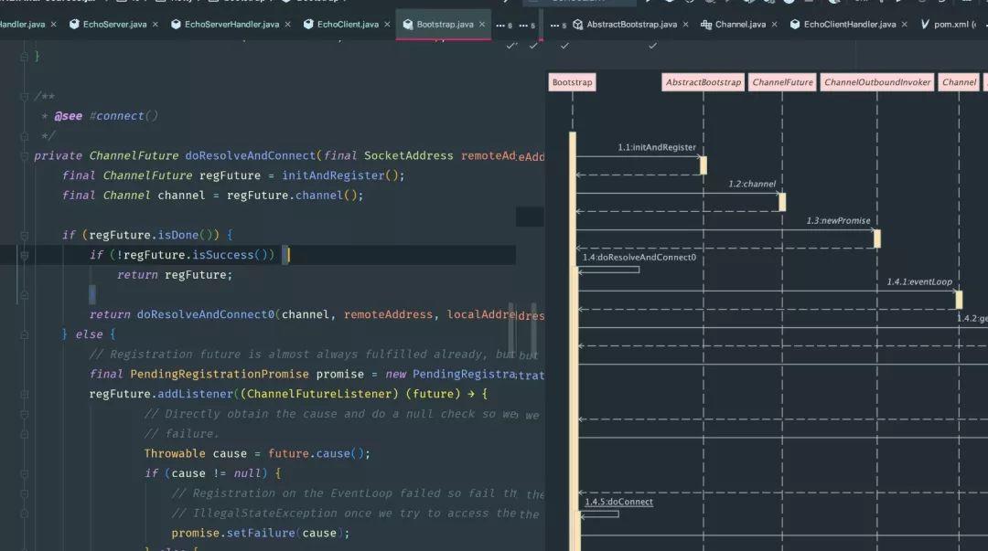 如下图是 Netty 的源码,可以通过该插件绘制出当前函数的调用链路。