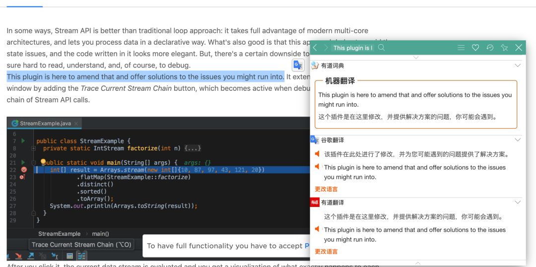 彩云翻译提供了中英文对照翻译的能力,如果看某些英文技术文章有些吃力,可以适当使用该插件实现中英文对照理解。