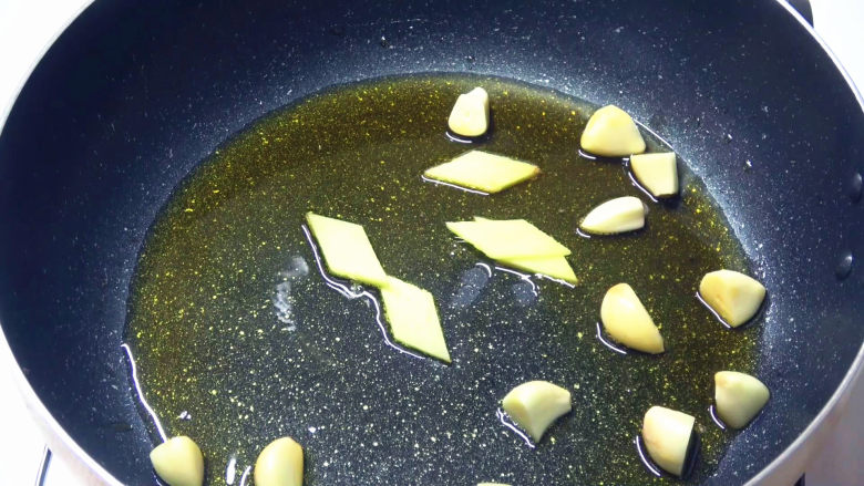 3.锅里放色拉油烧热,投入干花椒、泡椒节、姜片和蒜片炒香。