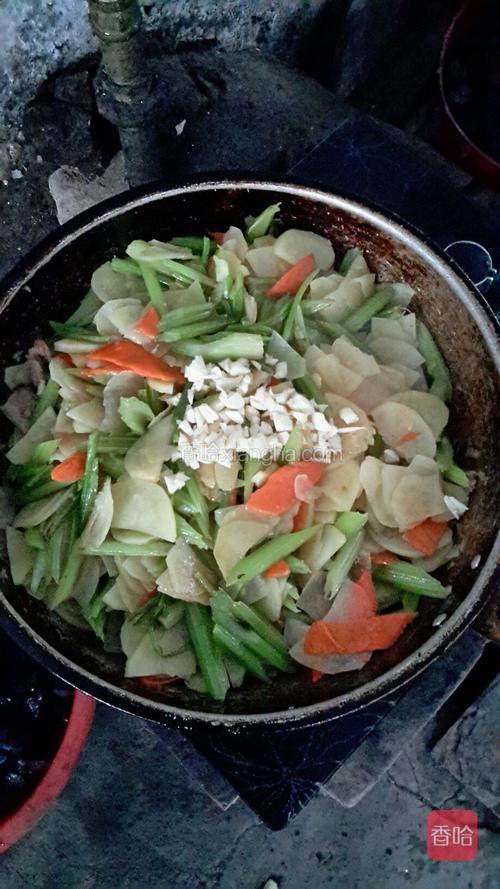 3.揭开锅盖后,下入芹菜节、小米辣节和子姜丝,翻匀并续烧一两分钟,其间加放盐、味精和鸡精调味,最后用湿淀粉勾芡,出锅装盘即成。