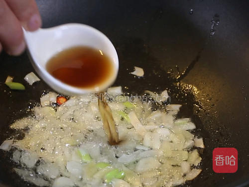 往锅里放熟菜油烧热,下入泡椒末、泡姜米、姜米和蒜米炒香出色后,出锅装入料缸待用。事先炒好泡椒酱,目的是为了提高出菜的速度。