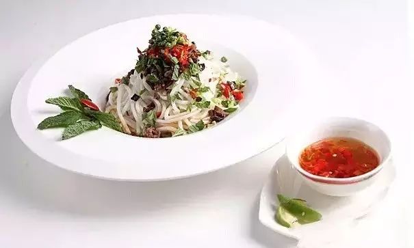 把米线放开水锅里汆断生,捞出来沥水后装盘,另外撒上煮熟的牛肉粒、薄荷叶碎、小番茄碎和鲜花椒,配鲜辣味蘸碟一起上桌。
