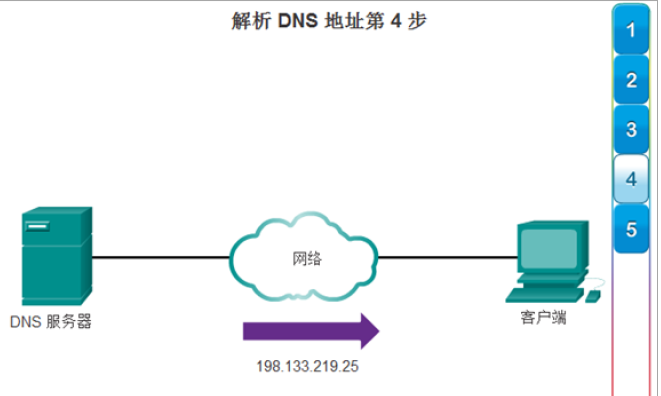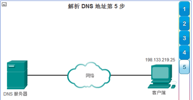 于是域名系统 (DNS) 应运而生,专门为大型网络提供域名的地址解析。DNS 使用分布式服务器群集来解析与这些数字式地址关联的域名。单击图中的按钮来查看解析 DNS 地址的步骤。