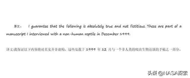 帖子第一句话就是:我保证以下内容绝对真实并非虚构,这些是我于1999 年12 月与一个非人类的爬虫生物访谈的手稿之一(部分)。这个雌性生命体几个月前已经联系了我的一个朋友(文章中以缩写EF 出现)。让我声明一下,我一生都对UFO、外星人和其他诡异事件抱持怀疑态度,而当我的朋友 向我讲述他第一次和那个非人类的爬虫族(Lacerta)存在体接触时,我想那只是个梦见或虚构的故事。我于去年12 月16 日在瑞典南部一个小镇附近我朋友家偏僻房子的温暖屋内面见这个生命体的时候,尽管我亲眼见到了她不是个人类,我仍然是个怀疑论者。那次面见,她向我讲述和展示了那么多难以置信的事情,以至于我无法再拒绝她所陈述的事实和真相。这不是那种说是事实、实际上却是编造的UFO 档案,我确信这份手稿有的只是真相,因此你们大家该去读它。