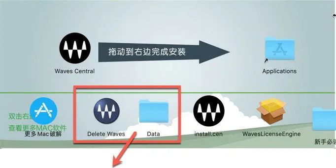 下载完成后打开“waves complete mac 镜像包快手特效工具下载激活,将左侧【Waves Central】拖入右侧应用程序中进行安装,如图: