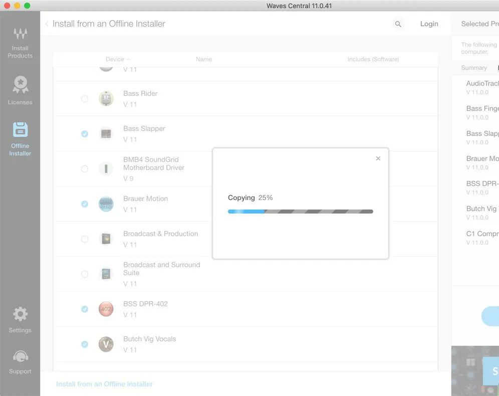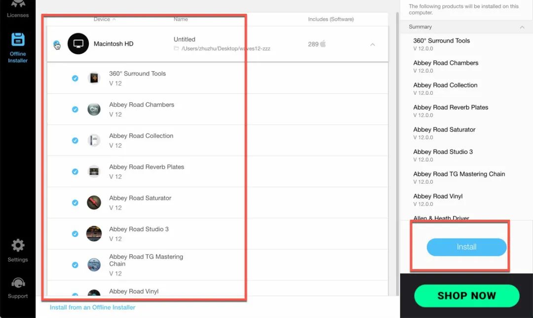 在Waves Complete中选择需要安装的插件,点击右下角【INSTALL】,如图: