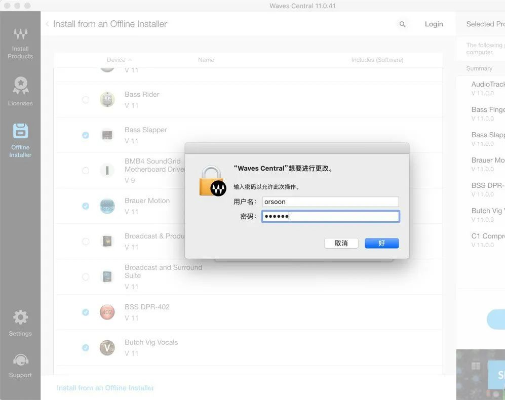 输入电脑密码允许Waves Complete补丁安装,如图: