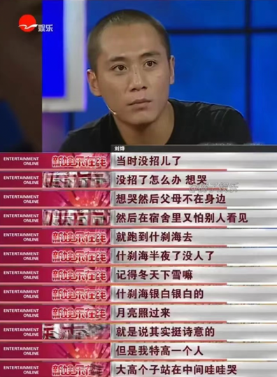 考入中戏后,刘烨性格敏感,因为压力太大总想退学,不敢在宿舍哭,就半夜跑去什刹海,站在冰湖上哇哇地哭。