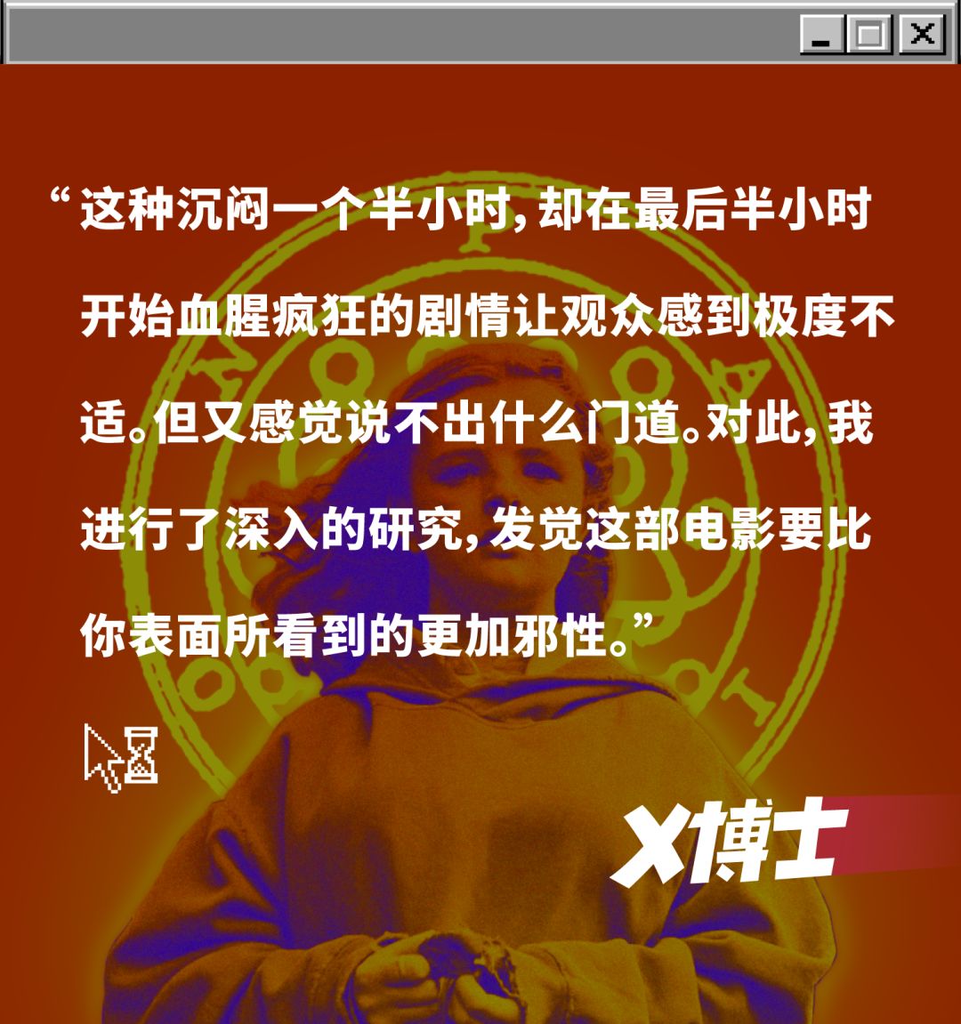 基本所有人看完电影之后不明觉厉,一头雾水。但又觉得邪气逼人。观众对这种沉闷一个半小时,却在最后半小时开始血腥疯狂的剧情感到极度不适。但又感觉说不出什么门道。对此,我进行了深入的研究,发觉这部电影要比你表面所看到的更加邪性。