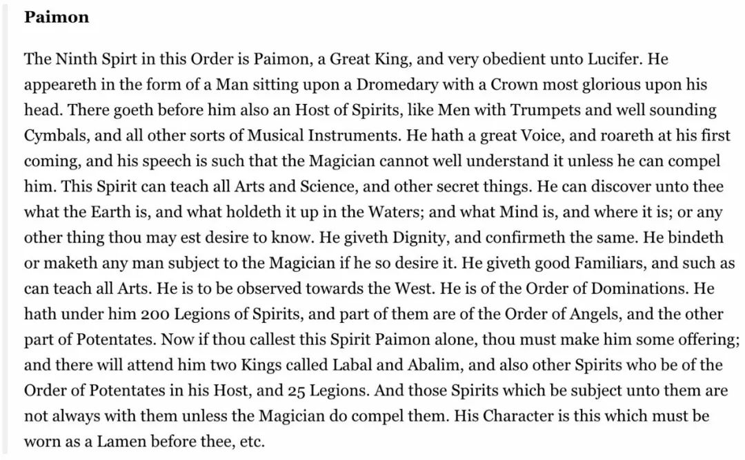 △《所罗门的小钥匙》中,对于派蒙的详细描述