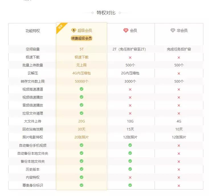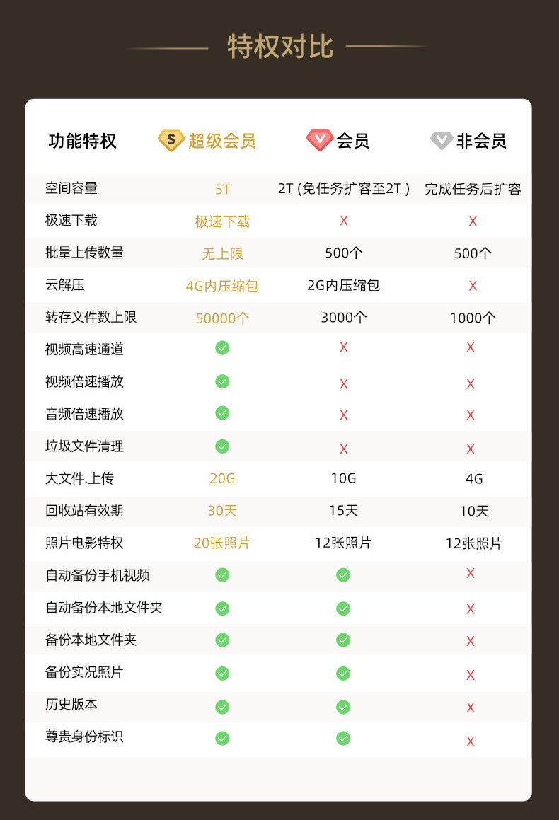 通过下图特权对比可以看出,非会员是通过任务就可以扩容的,任务非常简单,扩容后是2TB,而普通会员则不用完成任务就可以完成2TB的扩容,超级会员空间容量则是提高到了5TB。在空间容量上非会员跟普通会员其实 是没有太大的区别的。极速下载也只有超级会员有此特权,普通会员跟非会员都没有此特权。普通会员比除非会员多的权益只有云解压、转存文件数量上限、大文件上传(10GB)、回收站有效期比非会员多5天,再就是一些附加功能了,例如自动备份手机视频、自动备份本地文件、之类的了。超级会员比普通会员多了空间容量(5TB)、极速下载、上传数量(无上限)、云解压(4G内压缩包)、转存问价数上限(50000个)以及视频高速传输通道、视频音频倍速播放、垃圾文件清理、大文件上传(20GB )、回收站有效期(30天)、照片电影(20张照片)、在附加功能里比普通会员多了内容特权。