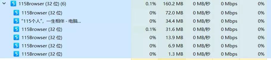 内存占用160M,不是很多,但是115网盘的PC端基本就是套了个浏览器的壳子。