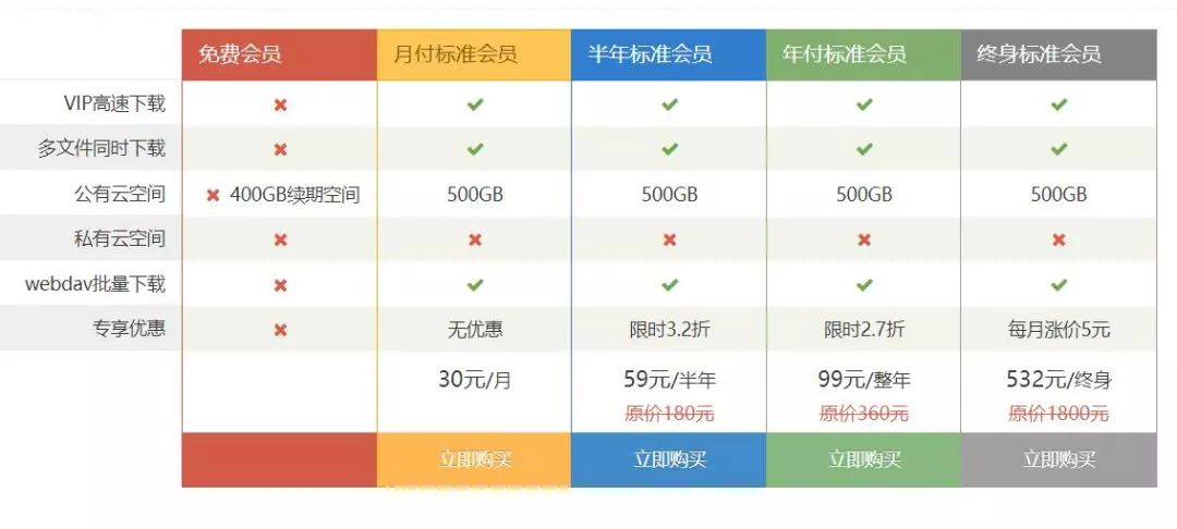 标准会员的权益有高速下载、多文件同时下载(多文件同时下载竟然还要充会员才能用)、webdav批量下载(webdav是一种通讯协议,具体可百度)。标准会员只有500GB的公有云空间,公有云的空间是共享的,按照官方的意思就是管理员和其他人可以看到并检索到你的文件,没有私有云空间。标准会员不管是按年付费还是按月付费权益都是相同的。