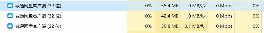 也不知道为什么,一下载蹦出来三个任务进程。三个加起来内存占用就超过120M了,其实城通网盘的客户端功能不多,功能不多占用这么大内存说明软件优化不够好。