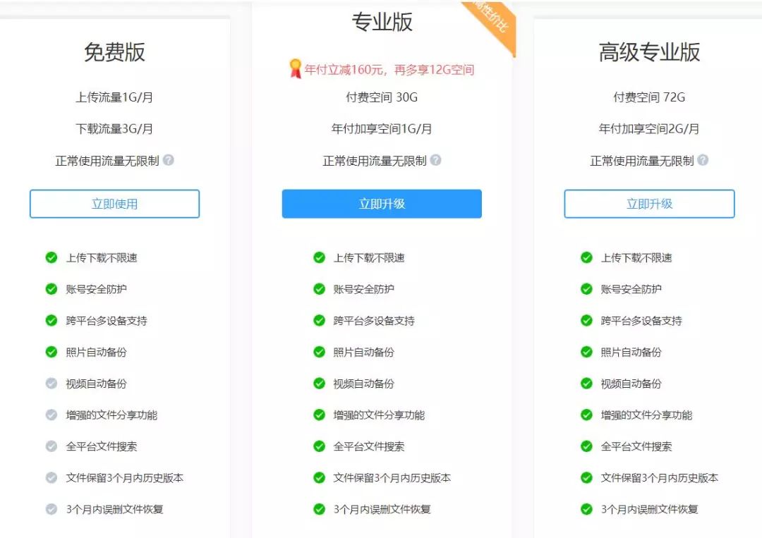 免费版就有上传下载不限速,并且还支持照片自动备份功能,空间不限量,这一点很良心,但是限上传下载流量。专业版比免费版多了专属的30GB付费空间以及特色功能方面,但是只在APP端好用,坚果云的PC端偏向于专业备份电脑指定文件夹。高级专业版在专业版的基础上增加了付费空间的容量,其他没有差别。