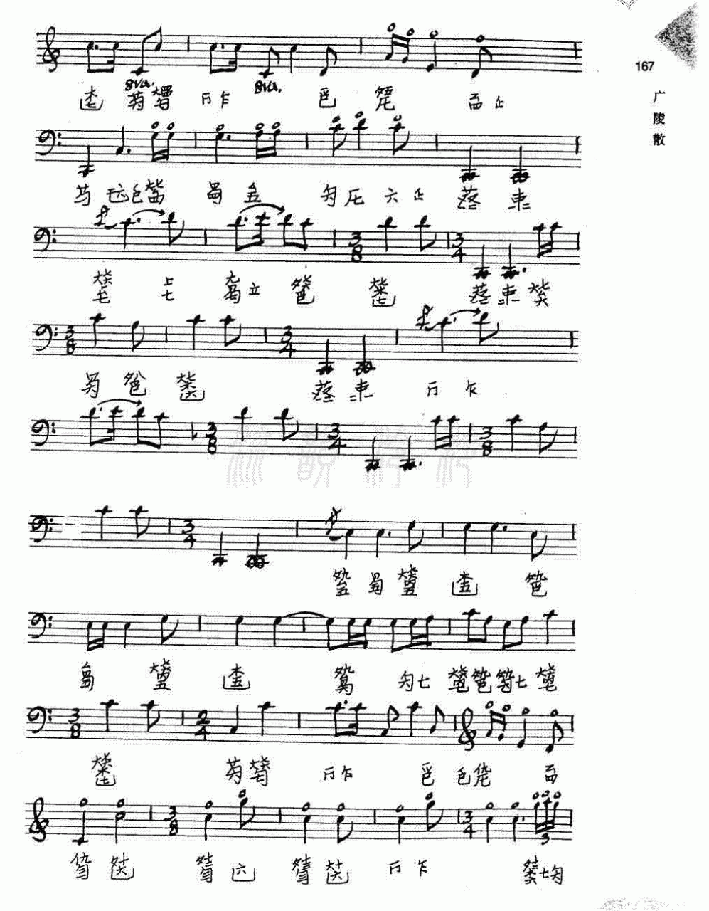 据赵西尧等著《三国文化概览》的描述,《广陵散》乐谱全曲共有四十五个乐段,分开指、小序、大序、正声、乱声、后序六个部分。《广陵散》在清代曾绝响一时,建国后我国著名古琴家管平湖先生根据《神奇秘谱》所载曲调进行了整理、打谱,使这首奇妙绝伦的古琴曲音乐又回到了人间。