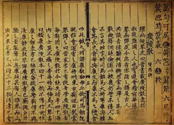 《广陵散》的来历:据《晋书》记载广陵散古琴曲,此曲乃嵇康游玩洛西时,为一古人所赠。而《太平广记》里更有一则神鬼传奇,说的是嵇康好琴,有一次,嵇康夜宿月华亭,夜不能寝,起坐抚琴,琴声优雅,打动一幽灵,那幽灵遂传《广陵散》于嵇康,更与嵇康约定:此曲不得教人。公元263年,嵇康为司马昭所害。临死前,嵇康俱不伤感,唯叹惋:”袁孝尼尝请学此散,吾靳固不与,《广陵散》于今绝矣!”。