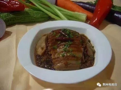 以肥瘦兼有的五花猪肉为原料,经煮炸,上红糖色,切成薄片荆州美食,以碗扣住蒸熟,由于肉片薄如纸,形如梭,片数多,故名千张扣肉,又名梳子肉。