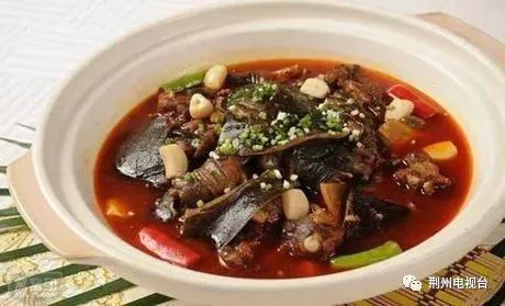 荆沙甲鱼是一道荆州的传统名菜,取之于洞庭湖的野生龟为主料,经精心烹制而成的。荆州龟这道菜源远流长,战国末年,《楚辞·大招》中开列的宴席单荆州美食,列有较多的水鲜菜式,其中尤以荆沙龟最具风味。龟历来都是公认的滋阴凉血润燥之品。