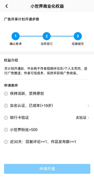 项目介绍 相信很多老铁对QQ都是带有回忆的,那么QQ小世界是什么呢? QQ小世界是腾讯公司旗下的手机QQ推出的短视频板块,类似于微信视频号。它拥有庞大的用户基础和流量规模。每天有亿万QQ用户在该平台上活跃。与其他平台相比,QQ小世界的地位甚至超过了很多短视频平台,也是一个备受关注的短视频平台。 项目流程 在过去,QQ小世界并没有提供任何的变现途径,创作者发布作品无法获得收益。然而,最近QQ小世界推出了广告共享计划,为创作者提供了全新的变现途径。 只要满足500粉丝的门槛,你就可以参与这个计划。开通广告共享计划后,你的作品或主页将会插入一些广告。 随着浏览量的增加,你将获得相应的收益和奖励。每万次播放的收益可达20元左右。