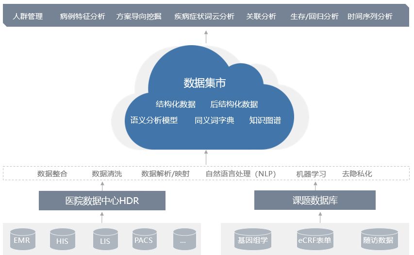 平台架构设计 大数据科研分析平台的构建是以医院数据中心(HDR)为基础,辅以基因组学、eCRF表单及随访数据等,形成全量的专病数据库;在经过数据整合、清洗、自然语言处理、机器学习及去隐私化等技术处理后,形成数据集市,包含结构化及后结构化数据;在此基础上,通过语义分析模型、同义词字典、知识图谱等算法百度大数据分析平台,进一步挖掘疾病症状之间潜在关联等,实现数据的深度应用。平台架构如图1所示。