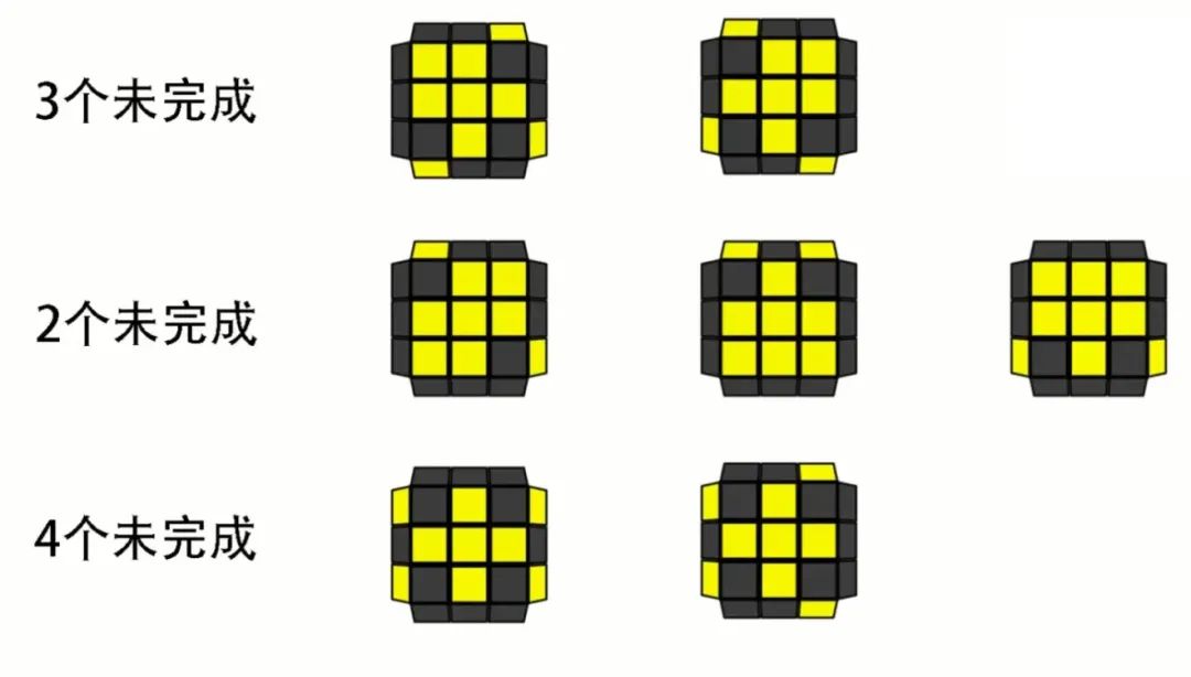 顶层角块一共有七种情况。依未完成角块的数量分为三类:三、二和四。不存在只剩一个角块未还原的情况。