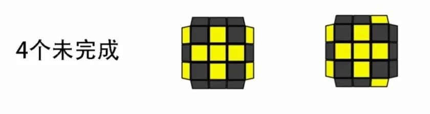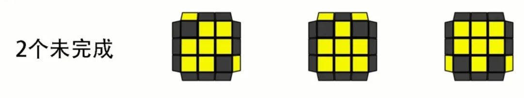 魔方在前两层全部还原时,顶层黄色朝上的棱的数量只有3种可能:0(点形)、2(条形和折形)和4(十字)。若不是,则魔方装配错误。