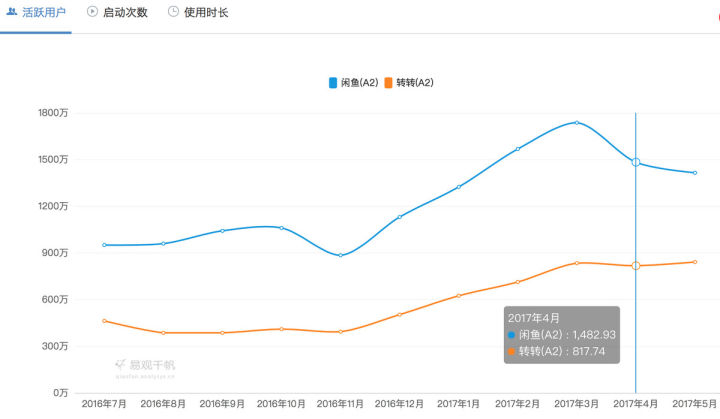 闲鱼自2014年从淘宝二手拆分,到现在已经有3年,用户量、交易额和活跃度都处于领先地位。